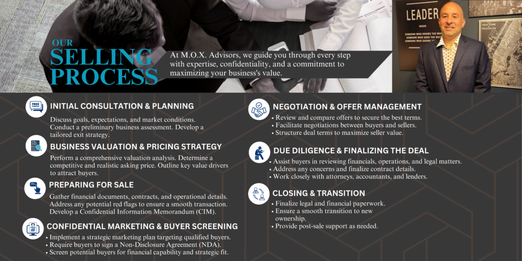 At M.O.X. Advisors, we handle the heavy lifting so you can focus on running your business while we find the right buyer at the best price. Contact us today to get started!