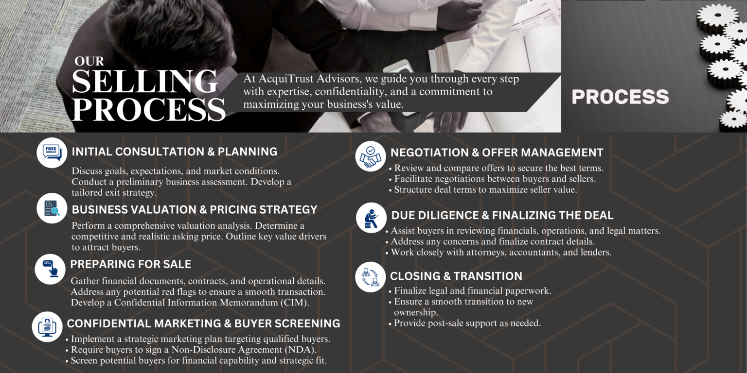 At AcquiTrust Advisors, we streamline the process by proactively managing timelines, preparing all necessary documentation in advance, and connecting sellers with qualified buyers to close deals as efficiently as possible.